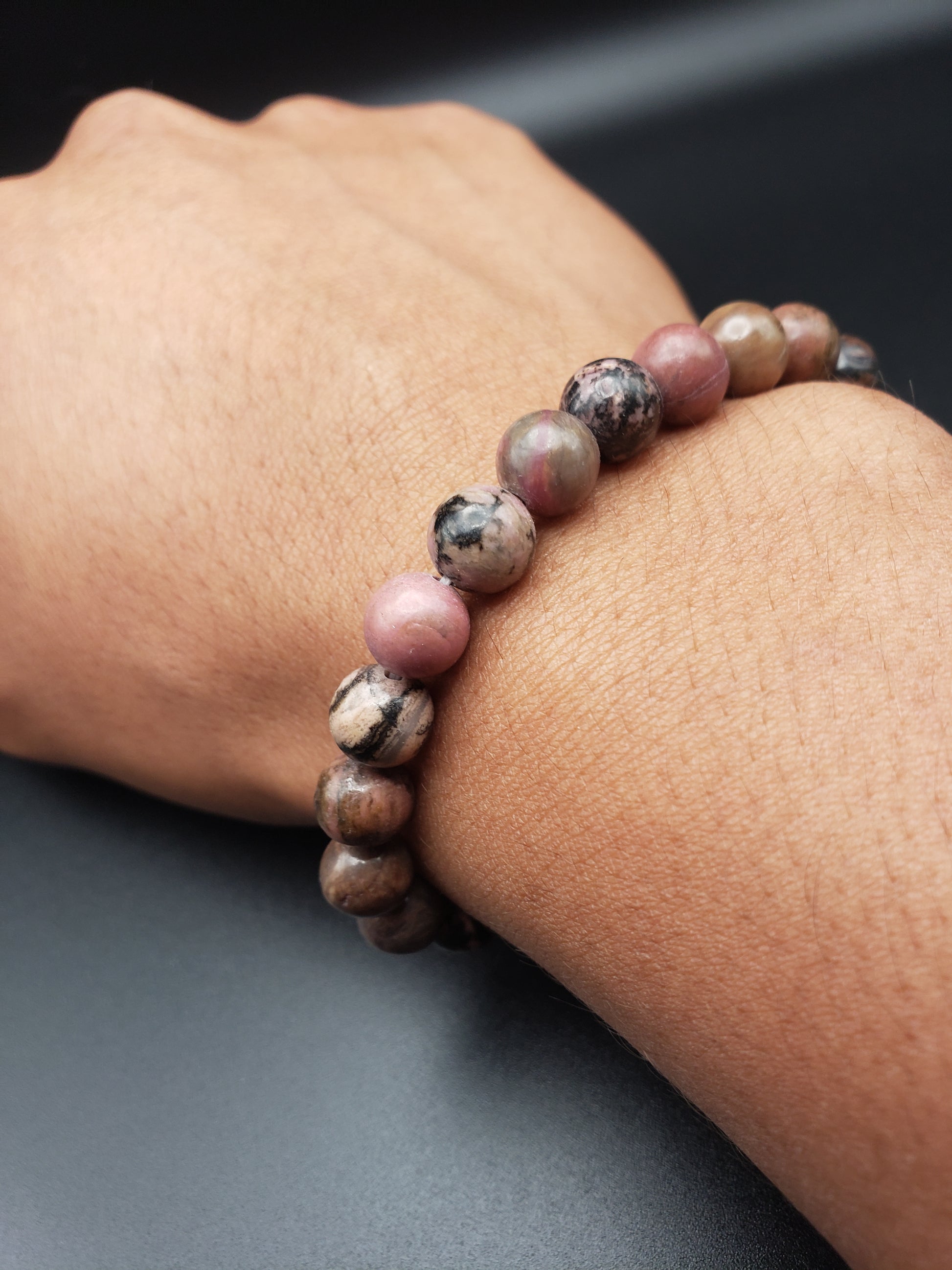 A rhodonite bracelet is valued for its emotional healing properties, helping to soothe anxiety, heal emotional wounds, and promote forgiveness. It encourages compassion, self-love, and emotional balance, making it easier to release past trauma. Rhodonite's nurturing energy supports healthy relationships and fosters inner peace.